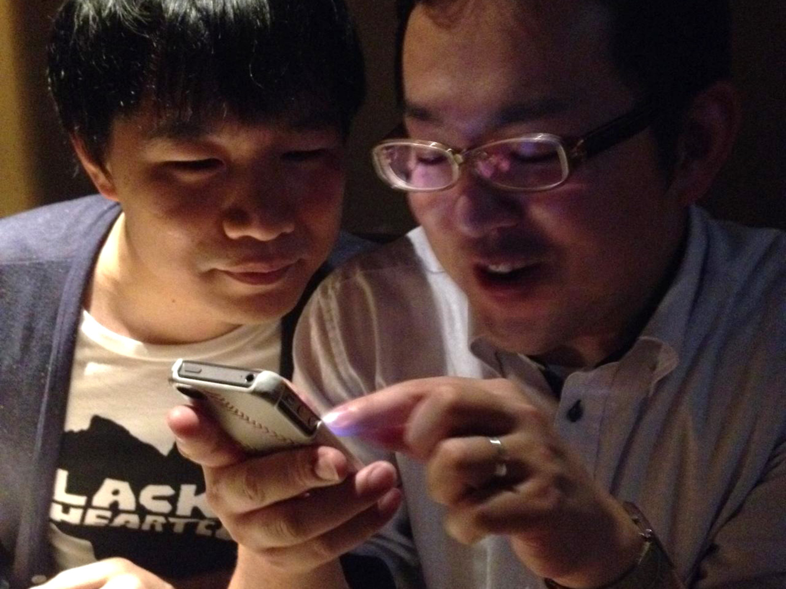 サムソンのスマホを興味深そうに覗くキャプテンの図。