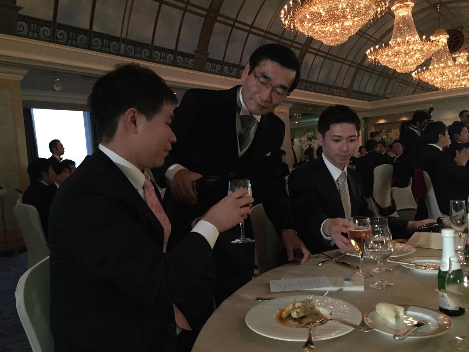 和田しゃんのお父さんにお酒をついでもらう吉田