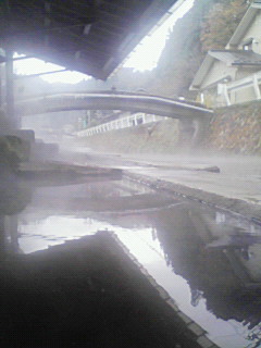 写真、画面下半分が湯船、となりに白く写っているのが満願寺川の流れです。